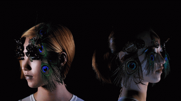 The peacock feathers make the movement of the cockroach appear larger and give it a mysterious, space-like appearance.